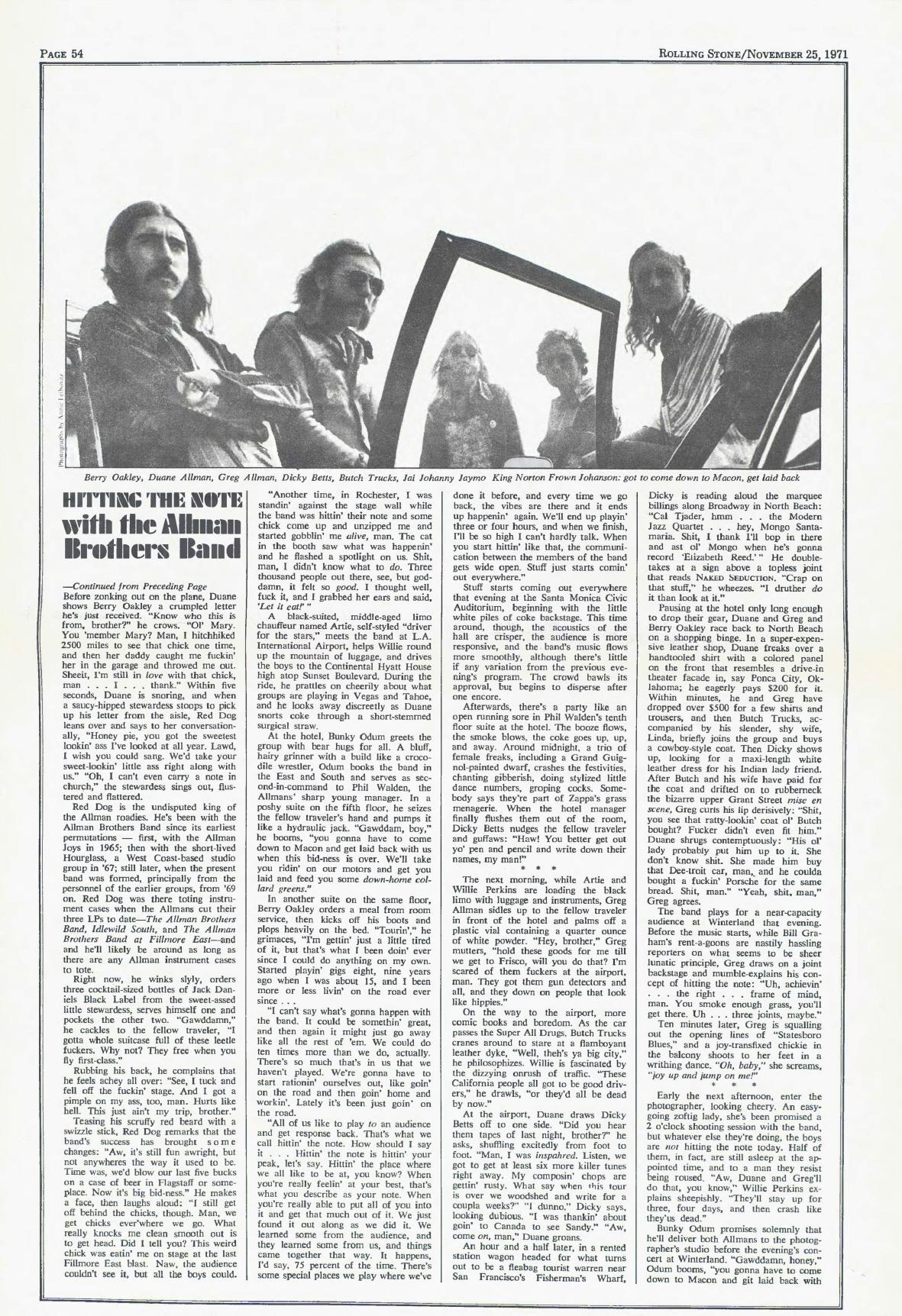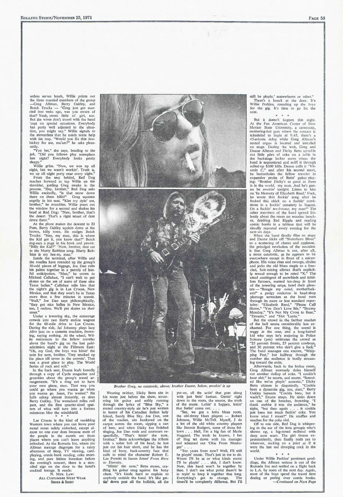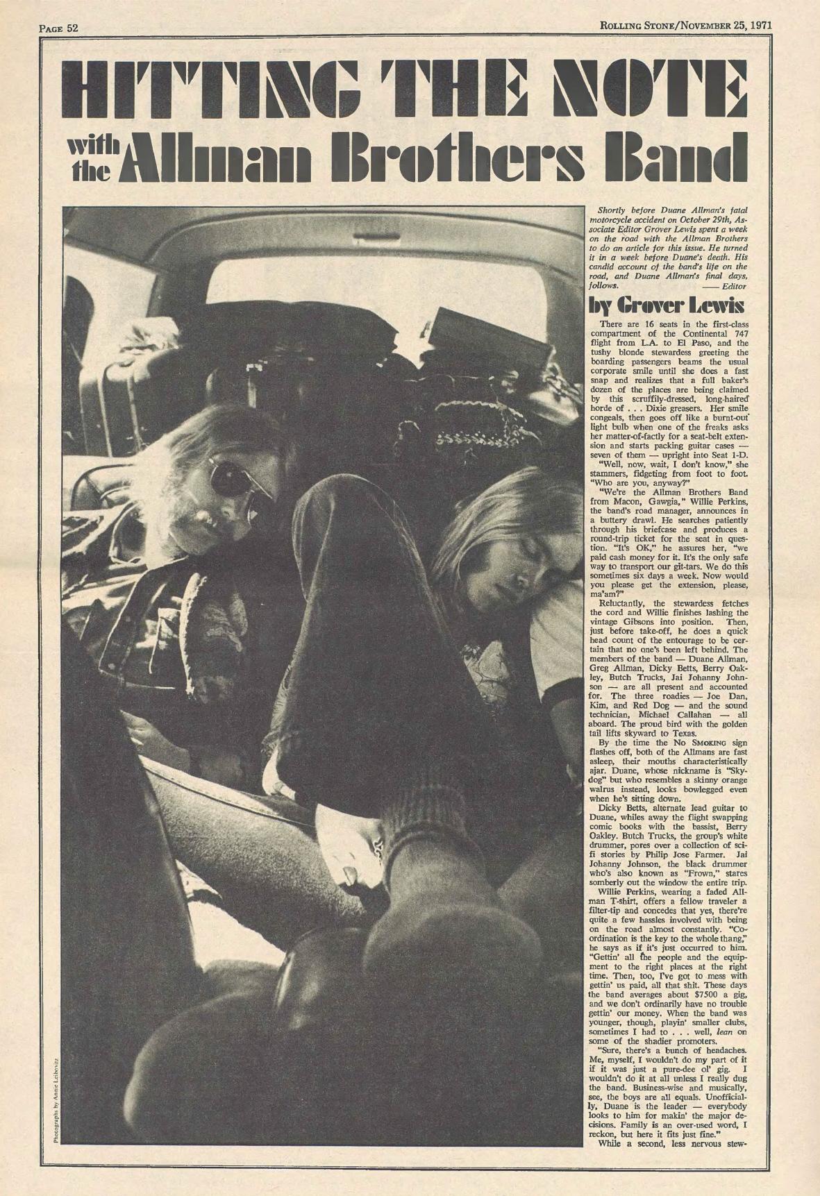 Shortly before Duane Allman's fatal motorcycle accident on October 29th, Associate Editor Grover Lewis spent a week on the road with the Allman Brothers to do an article for this issue. He turned it in a week before Duane's death. His candid account of the band's life on the road, and Duane Allman's final days, follows. --- Editor