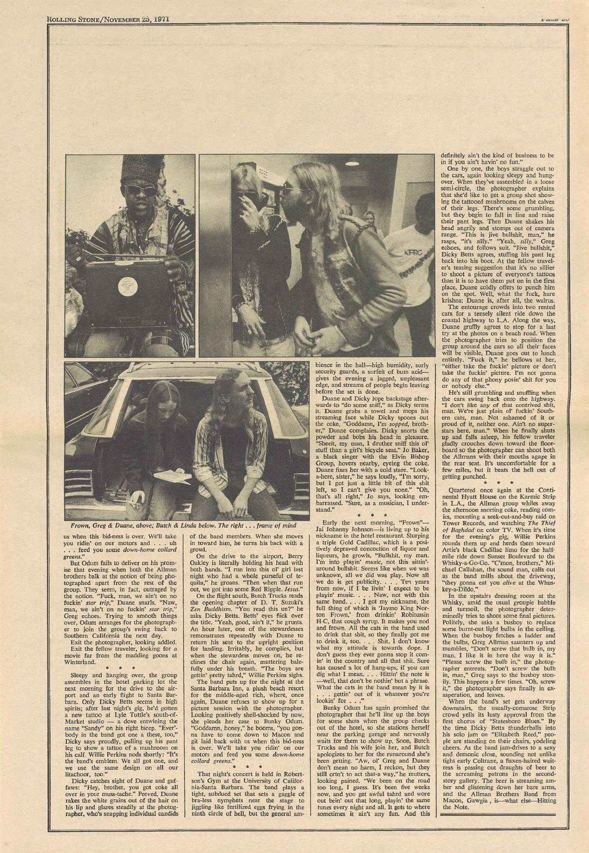 One by one, the boys straggle out to the cars, again looking sleepy and hungover. When they've assembled in a loose semi-circle, the photographer explains that she'd like to get a group shot showing the tattooed mushrooms on the calves of their legs. There's some grumbling, but the begin to fall in line and raise their pant legs. Then Duane shakes his head angrily and stomps out of camera range. "This is jive bullshit, man," he rasps, "it's silly." "Yeah, silly," Greg echoes, and follows suit. "Jive bullshit," Dicky Betts agrees, stuffing his pant leg back into his boot. At the fellow traveler's teasing suggestion that it's no sillier to shoot a picture of everyone's tattoos than it is to have them put on in the first place, Duane coldly offers to punch him on the spot. Well, what the fuck, Hare Krishna; Duane is, after all, the walrus.